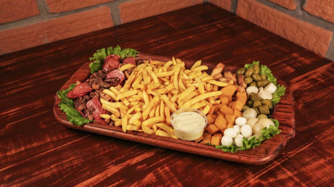 PEPINO, CEBOLA, PALMITO, OVO DE CODORNA, AZEITONA, BATATA E POLENTA FRITA, AIPIM, FILE DE TILAPIA, CARNE DE FRANGO, GADO, CORACAO E CALABRESA